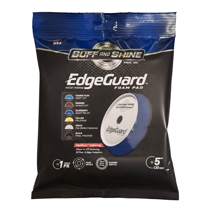Buff and Shine 5" EdgeGuard™ Foam Grip Buff Pad, Blueberry, Heavy Cut (556EG) are designed for random orbital and gear driven polishers and are revolutionizing the detailing industry with advanced technology for perfect centering and backing plate edge protection. Perfect for use on cars, boats, aircraft and RVs.