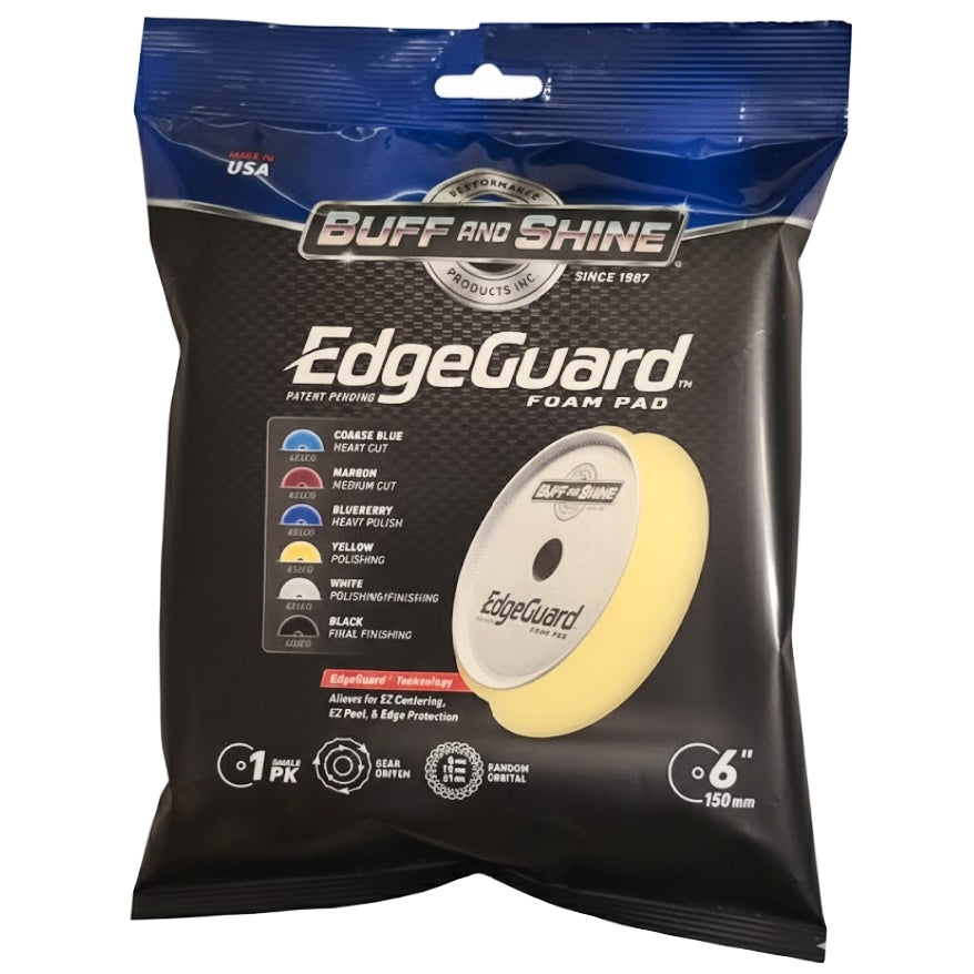 Buff and Shine 6" EdgeGuard™ Foam Grip Buff Pad, Yellow, Polishing (634EG) are designed for random orbital and gear driven polishers and are revolutionizing the detailing industry with advanced technology for perfect centering and backing plate edge protection. Perfect for use on cars, boats, aircraft and RVs.