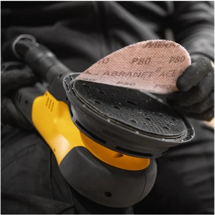 The Mirka DEROS uses a standard US 5/16" 24-thread connector for backup pads. Mirka offers a wide selection of 6" backup pads compatible with this machine, click here for more info. Also available is the 915GV28-130 backup pad, a 130-gram weighted 5" backup pad, specifically designed for 6" sanders so you can use both 5" and 6" grip sanding discs with your 6" DEROS.
