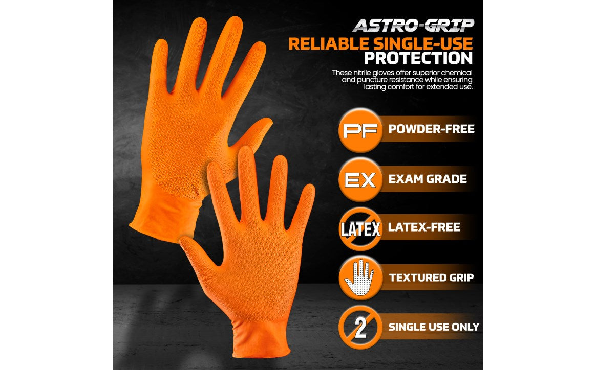 SAS Safety ASTRO GRIP™ Textured Nitrile Disposable Gloves are engineered to provide you with the ultimate grip with its dual scale texture and high visibility orange color. This 7-mil nitrile glove is latex-free and powder-free providing superior comfort, fit and strength.