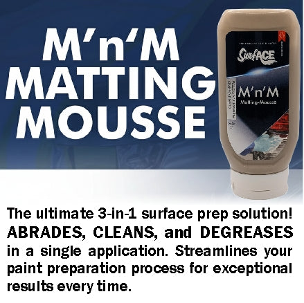 Surf-ACE M'n'M Matting-Mousse, 500g (70085/US) is a triple action, water-based, flatting paste for paint surface preparation; it abrades, cleans and completely degreases in one simple step.